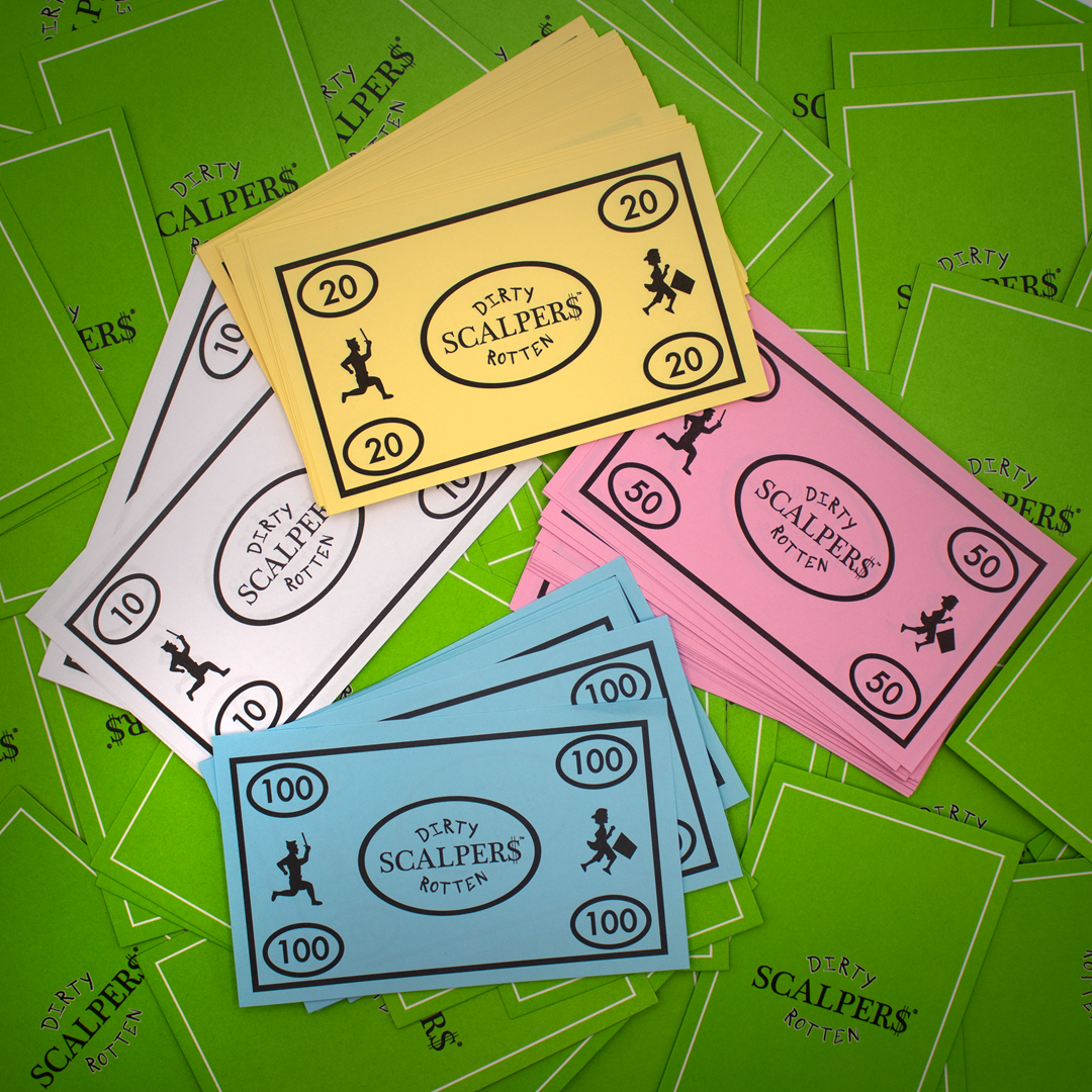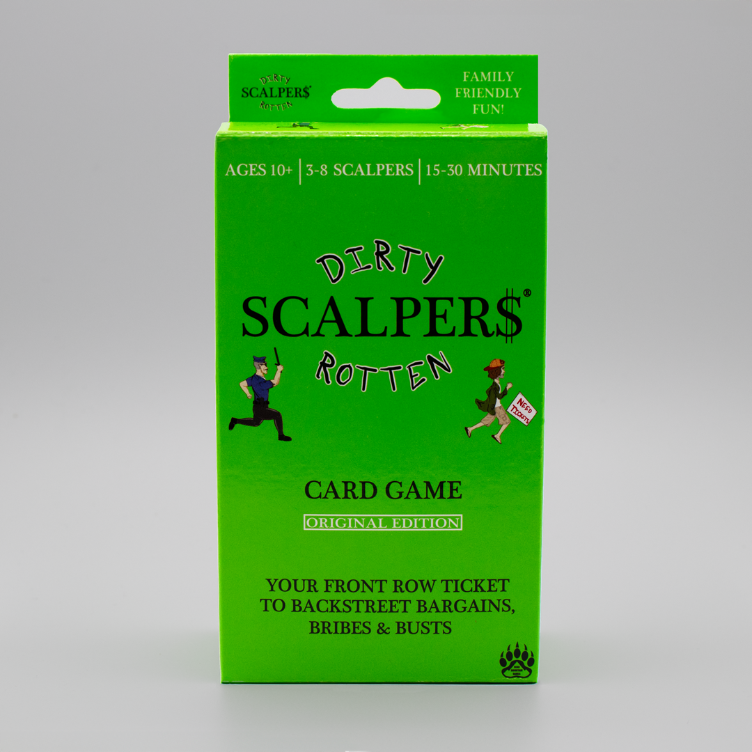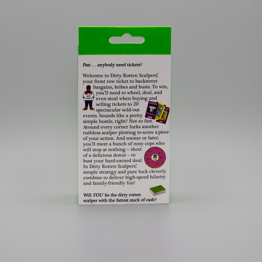 Details: 98 cards, 150 Scalper Bucks. Dirty Rotten Scalpers is the perfect gift for card game lovers ages 10 and up. 15–30 min. play time. High-speed hilarity and family-friendly!